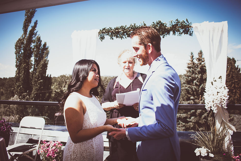 their wedding vows in an intimate rooftop patio celebration.